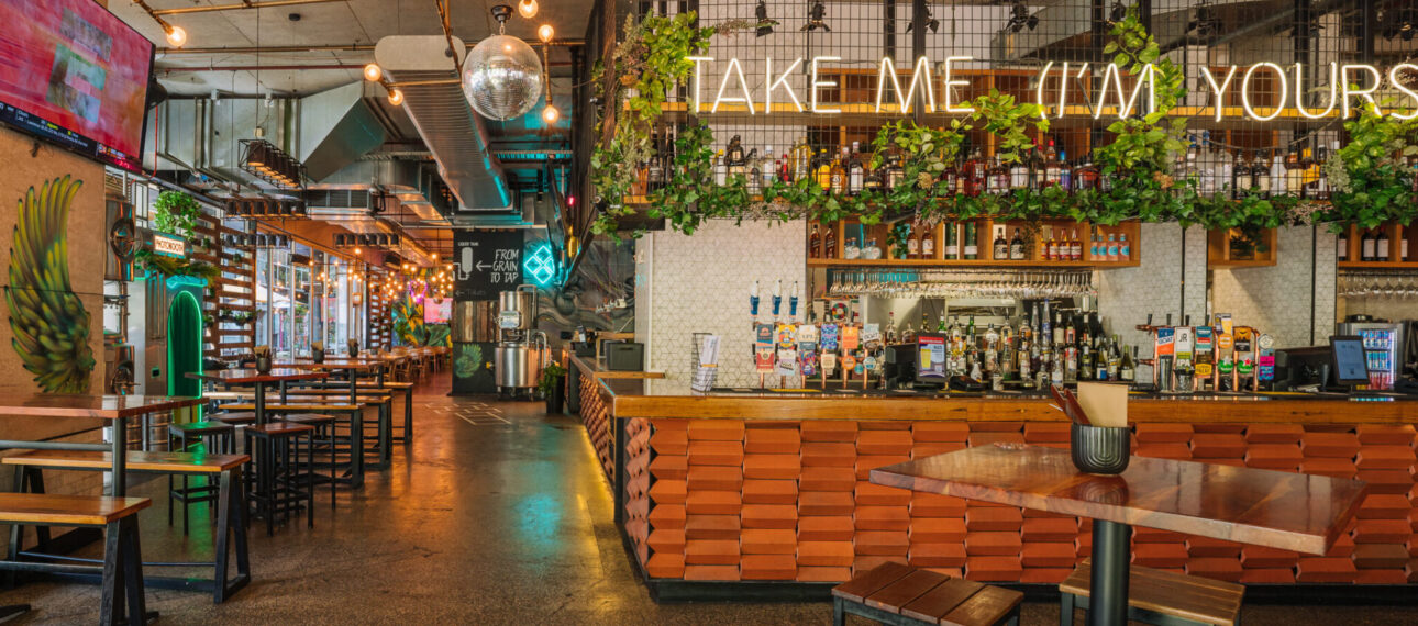 The venue features a riverside terrace, providing patrons with scenic views of the Yarra River and the city skyline. The interior is adorned with neon signage, hanging plants, and floral murals, the perfect environment to enjoy a diverse selection of food and drinks.